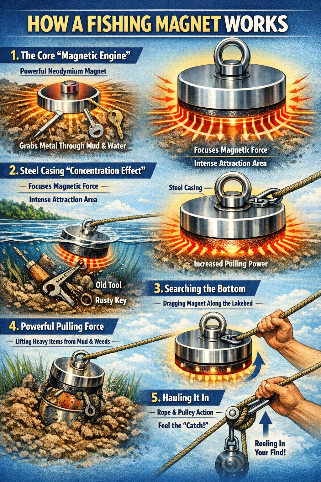 보이지 않는 그립: 멀리 있거나 두꺼운 진흙과 모래 속에서도 이 자기장은 한 쌍의 보이지 않는 손처럼 작용하여 물 밑바닥에 있는 철 함유 물체를 빠르게 붙잡습니다.