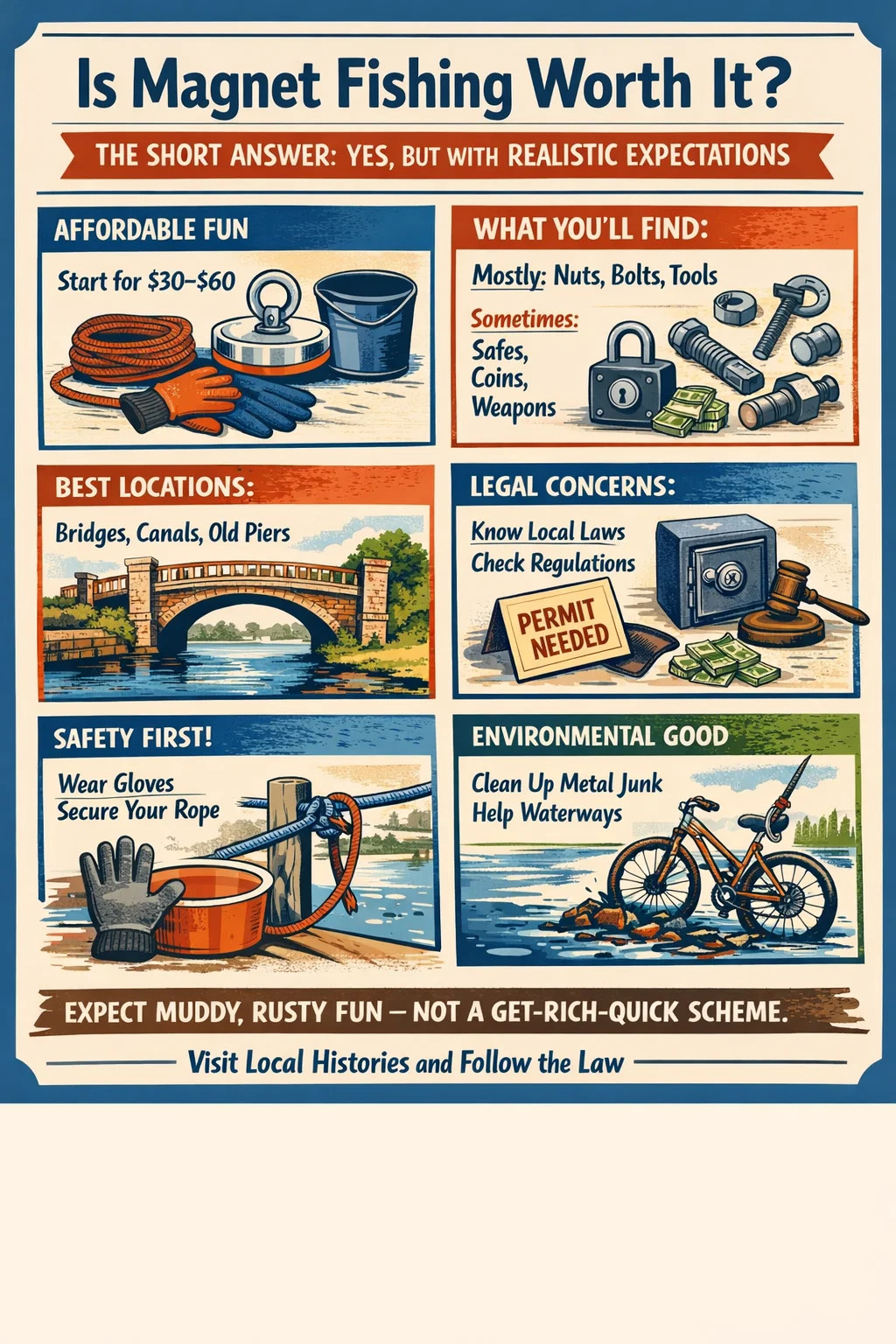 Yes, magnet fishing is worth it for most people — but only if you go in with realistic expectations. It is an affordable outdoor hobby that combines physical activity, treasure hunting, and environmental cleanup. You are not guaranteed to pull up Civil War swords or stacks of cash, but you will almost certainly find interesting metal objects, and many hobbyists report that the process itself is addictive regardless of what they haul up.