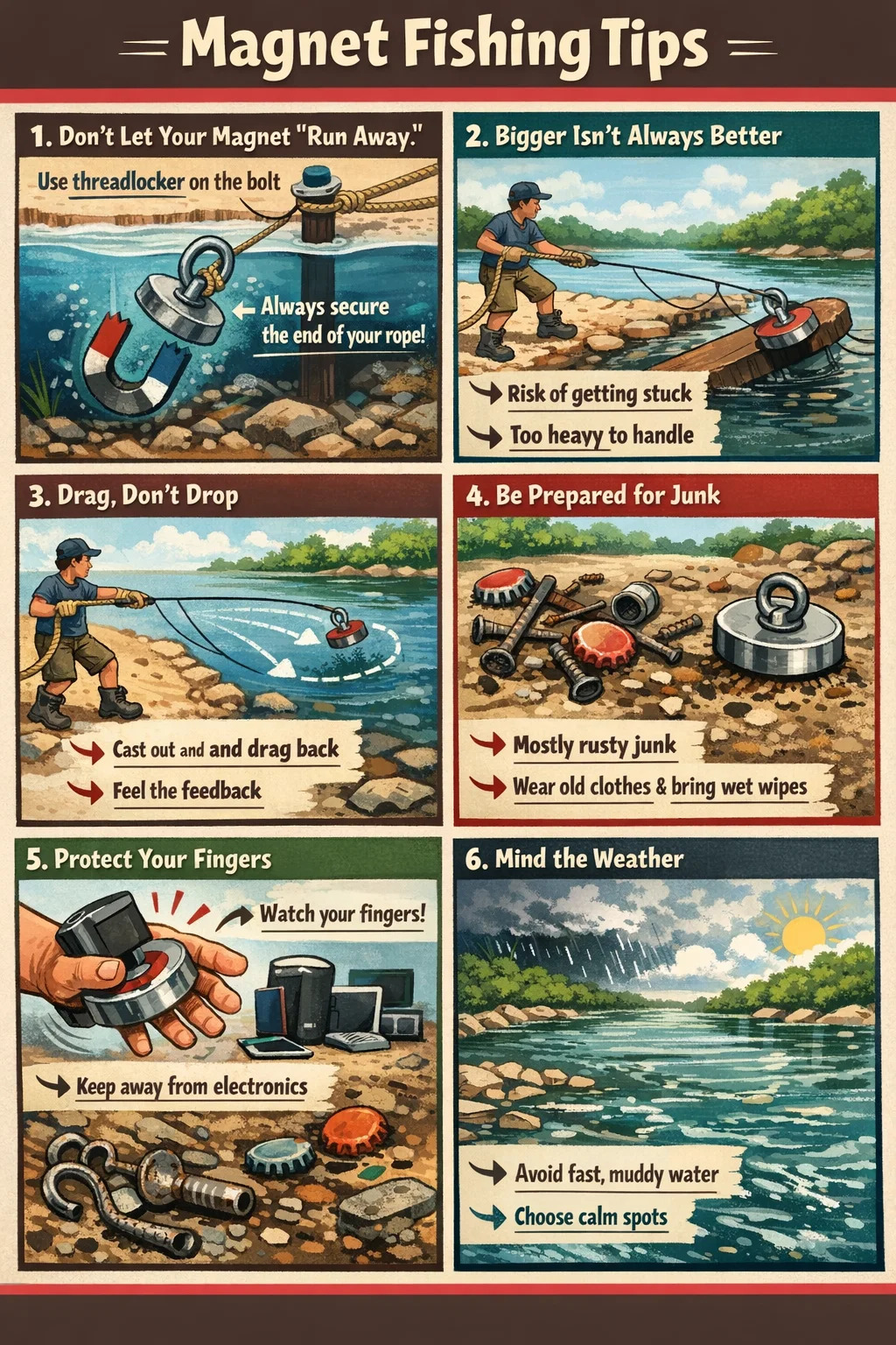 Secure the end of the rope: When throwing the magnet, the other end of the rope must be tied to your waist or a post on the shore. The embarrassing situation of throwing the entire rope into the river due to excessive force happens every day.