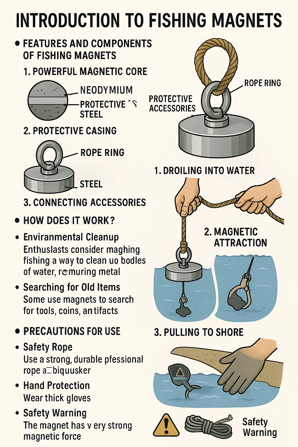 환경 정화: 많은 매니아들은 이것이 버려진 금속 파편, 자전거 프레임, 타이어 림 및 기타 금속 폐기물을 끌어 올려 수역을 청소하고 환경을 보호하는 방법이라고 생각합니다. 오래된 항목 검색: 때때로 사람들은 물 속에 남겨지거나 버려진 오래된 도구, 동전, 부품 및 기타 역사적 유물을 검색하고 회수하기 위해 자석을 사용합니다.