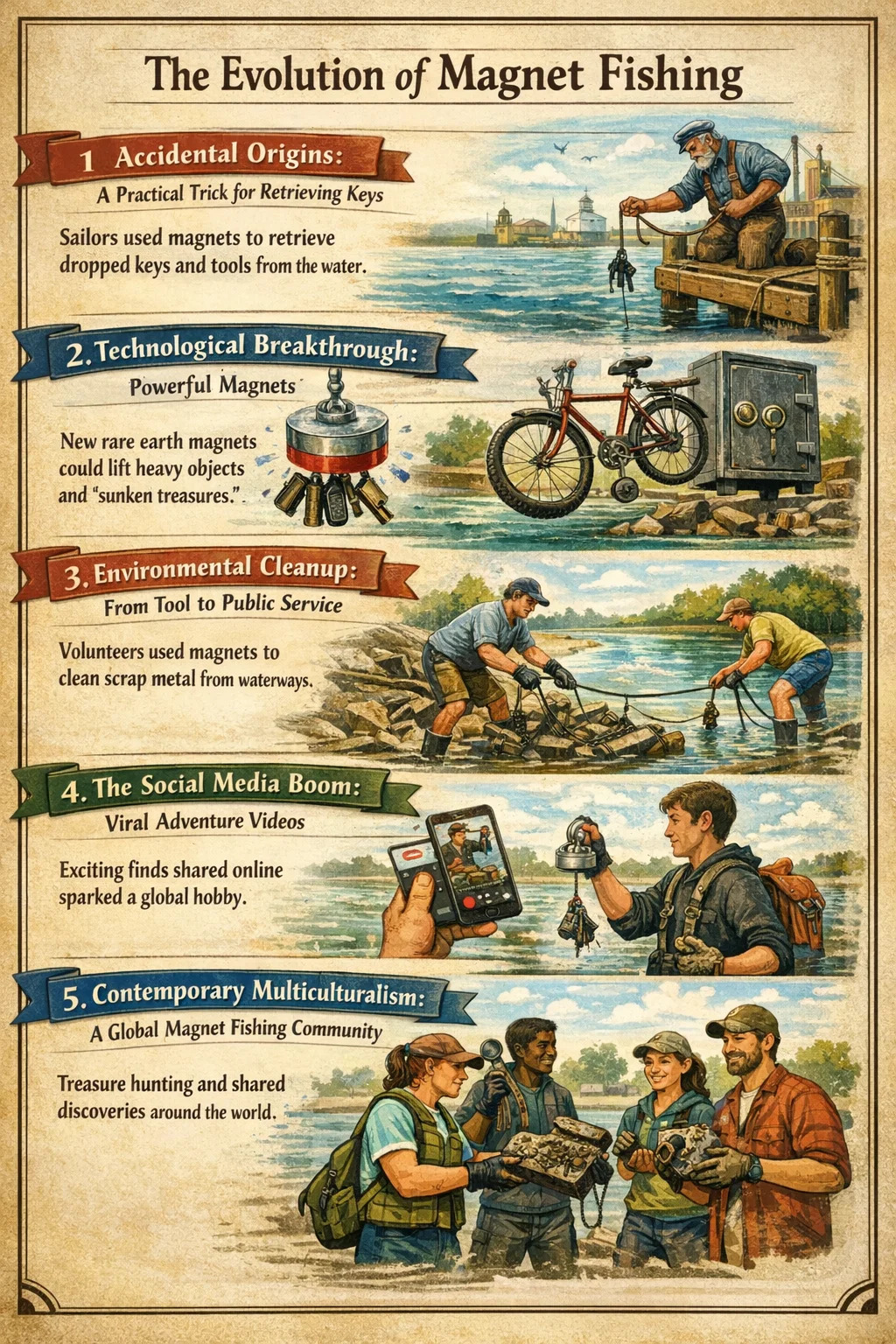 글로벌 커뮤니티: 요즘에는 사람들이 장비 팁과 최신 발견을 공유하여 자석 낚시를 틈새 도구에서 사람과 자연 및 역사를 연결하는 링크로 바꾸는 전용 커뮤니티가 전 세계에 있습니다.