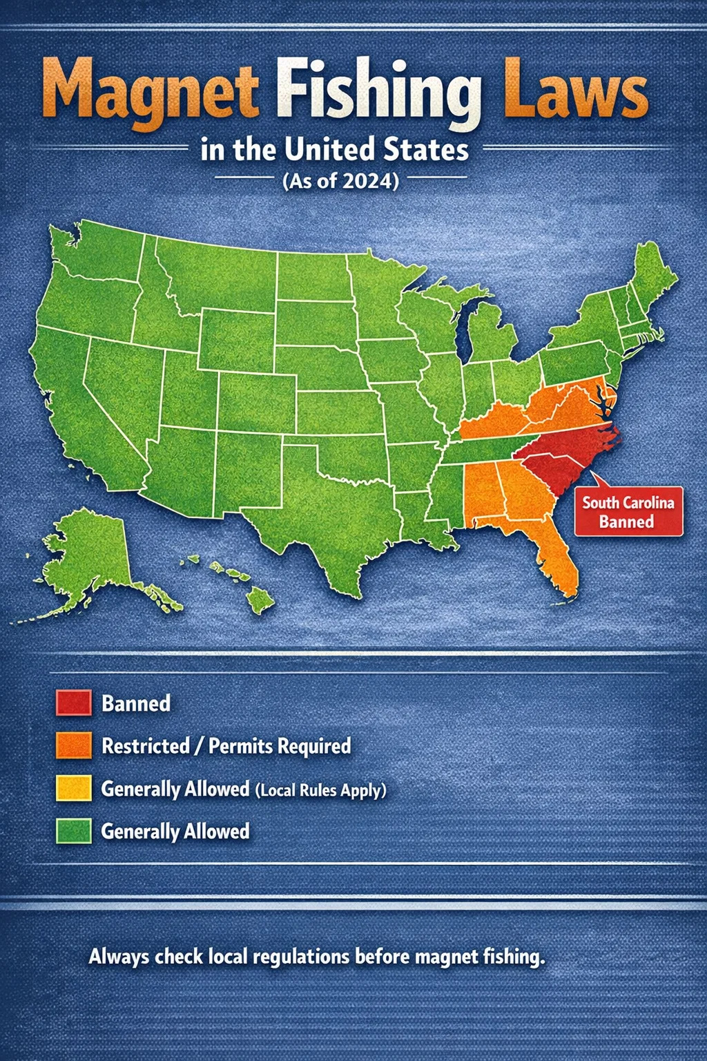 사우스 캐롤라이나는 미국에서 유일하게 자석 낚시를 직접적으로 금지하는 주입니다. 사우스 캐롤라이나 천연자원부(SCDNR)는 모든 주 관리 수역에서 자석 낚시를 금지합니다. 이 규정은 주로 수중 고고학 유적지, 특히 주의 강과 해안 수로에 풍부한 남북 전쟁 시대 유물의 교란에 대한 우려 때문에 제정되었습니다. 사우스 캐롤라이나는 전국에서 가장 풍부한 수중 문화 유산을 보유하고 있으며, 주 공무원은 규제되지 않은 유물 복구의 위험이 너무 높다고 판단했습니다.