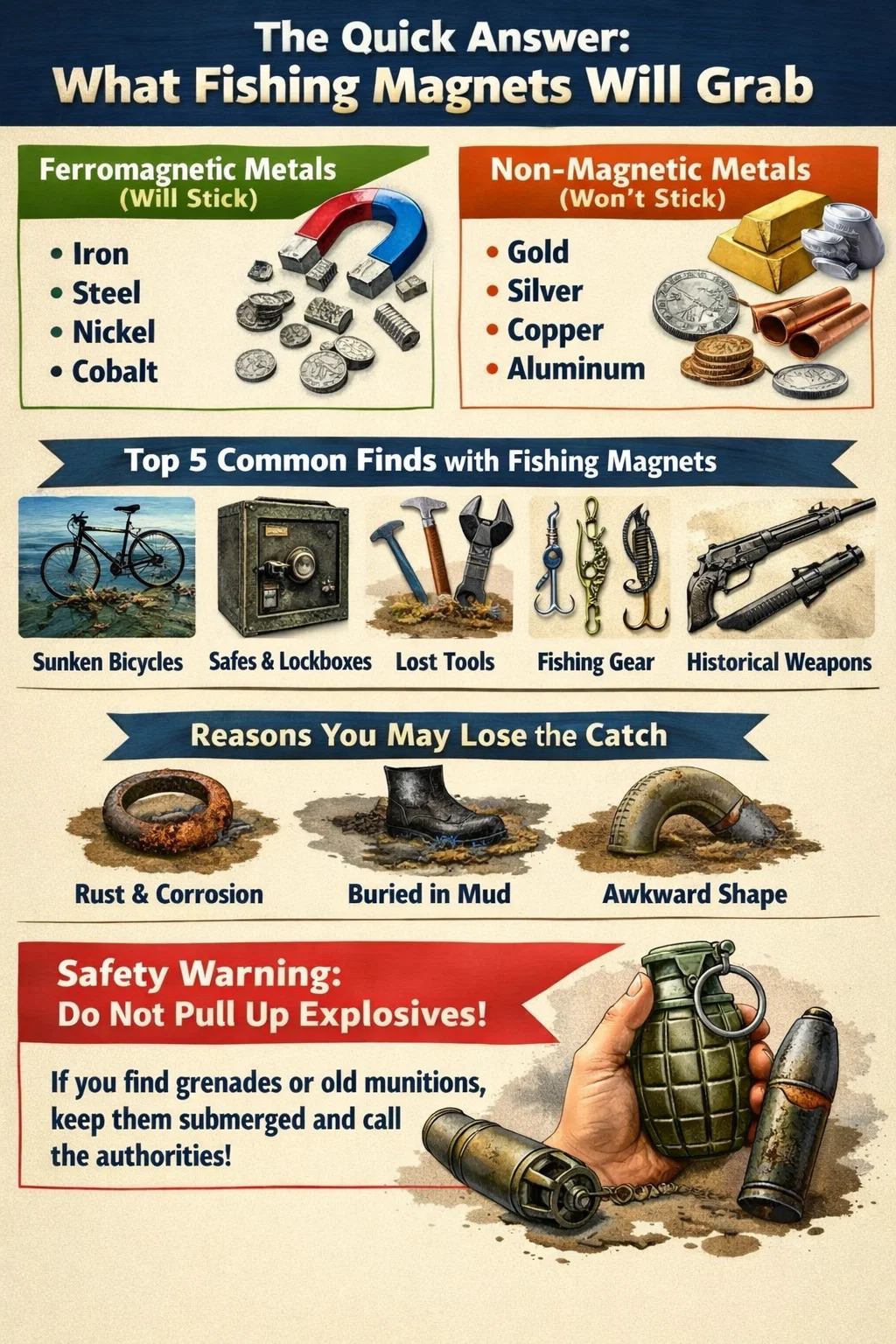동안 낚시 자석 발견의 도구이기 때문에 위험을 발견할 수도 있습니다. 유럽의 많은 지역과 미국의 일부 지역에서는 수류탄이나 오래된 박격포탄과 같은 불발탄(UXO)을 뽑아낼 수 있습니다. 이러한 품목은 여전히 활성 상태이고 매우 위험할 수 있습니다. 폭발물처럼 보이는 것을 본다면, 만지지 마세요 , 가능하면 물에 담그고 즉시 폭발물 처리반에 연락하세요.